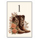 Guidez vos invités avec style avec ces élégants numéros de table, conçus pour compléter votre thème mariage Country Western moderne. Fleurs neutres brodées et charmantes bottes de cowboy, elles allient charme rustique et élégance intemporelle.
