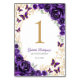 Cartes de numéro de table pour célébration Quinceanera or pourpre. Caractéristiques, police de caractères script, papillons dorés, roses aquarelles et diadème. Parfait pour une célébration glamour de style princesse élégante. Personnalisez avec vos propres détails. Invitations Zazzle imprimées ou modèle numérique téléchargeable instantanément.