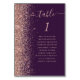Le bord gauche de cette élégante carte de numéro de table mariage moderne comporte une bordure rose en faux parties scintillant or. Le mot "table" apparaît dans un script d'écriture manuscrite rose rose sur un arrière - plan violet foncé. Ajoutez les noms de vos invités qui sont affectés à chaque table.
