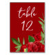 Aidez vos invités à trouver leurs sièges avec cette carte élégante rouge à fleurs. Les lettres et les chiffres sont dans une police de script, tandis qu'un arrangement floral rouge se trouve sous le texte.