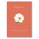 This elegant wedding table card features a beautifully detailed white peony flower centered on a soft coral background, creating a serene and sophisticated atmosphere. The minimalist design includes clean, sans-serif typography for the table number at the top and customizable names and date at the bottom, ensuring clarity and personalization. The harmonious color palette of creamy whites, greens, and peachy-coral enhances the natural beauty of the floral illustration, making it perfect for adding a touch of elegance to your wedding celebration.