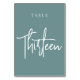 Des cartes numériques simples et chic en aqua turquoise poussiéreux et blanc font une déclaration élégante à votre mariage ou événement. Le design comporte "table [nombre]" dans un mélange de sérigraphie classique et de lettres manuscrites. Le design se répète de part et d'autre. Cartes numérotées individuellement vendues séparément; commandez chaque numéro de table individuellement de notre collection.