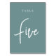 Des cartes numériques simples et chic en turquoise et blanc poussiéreux font une déclaration élégante à votre mariage ou événement. Le design comporte "table [nombre]" dans un mélange de sérigraphie classique et de lettres manuscrites. Le design se répète de part et d'autre. Cartes numérotées individuellement vendues séparément; commandez chaque numéro de table individuellement de notre collection.