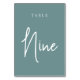 Des cartes numériques simples et chic en aqua turquoise poussiéreux et blanc font une déclaration élégante à votre mariage ou événement. Le design comporte "table [nombre]" dans un mélange de sérigraphie classique et de lettres manuscrites. Le design se répète de part et d'autre. Cartes numérotées individuellement vendues séparément; commandez chaque numéro de table individuellement de notre collection.