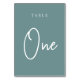 Des cartes numériques simples et chic en turquoise et blanc poussiéreux font une déclaration élégante à votre mariage ou événement. Le design comporte "table [nombre]" dans un mélange de sérigraphie classique et de lettres manuscrites. Le design se répète de part et d'autre. Cartes numérotées individuellement vendues séparément; commandez chaque numéro de table individuellement de notre collection.