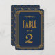 Ces numéros de table présentent une palette de couleurs bleue et or, un cadre géométrique, des motifs géométriques et d'autres détails stylistiques inspirés de l'Art Déco et des années folles. Vous pouvez personnaliser les champs de texte d'exemple à votre goût.