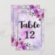 Numéros de table de mariage avec cadre en faux argent et fleurs aquarelles violettes et confettis, avec une police de caractères à pinceau tendance ! Découvrez toute la gamme de mariage pour ce design dans ma boutique !