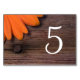Ajoutez une touche de charme à votre style de ferme rurale ou à votre thème de ranch western lors de votre douche nuptiale, réception de mariage ou fête de grange avec les numéros de table de mariage de grange aux marguerites orange rustiques, élégants et décontractés. Ces cartes de numéros de table botaniques personnalisées de style country chic présentent une photographie florale charmante de pétales de fleurs de marguerites orange gerbera sur un fond de bois de grange brun patiné.
