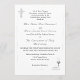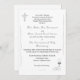 Design front features a pure white background to the elegant image of a silver crucifix at top left corner. Bottom right corner displays the image of the Holy Eucharist suspended above chalice with the image joined wedding rings displayed beside it. Following the traditional format for a Catholic wedding invitation, text is featured in an elegant silver-colored print. The names of bride and groom, along with event are displayed in a graceful Nuptial font. Design is accented by an elegant flourish aligning the left and right sides