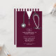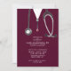 Creative nursing school grad party invites featuring maroon hospital scrubs and a stethoscope. Edit text to create a nursing school graduation party invitation or announcement.