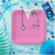 Unique nursing school graduation party plates featuring pink hospital scrubs, stethoscope, and Swiss Army knife design. Edit text to add name of your favourite nurse.
