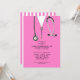 Creative nurse graduation invites featuring pink hospital scrubs and stethoscope. Edit text to create unique nurse party invitation or grad announcement.