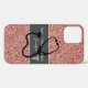 Protect your phone in style with this Nurse Practitioner Rose Gold Glitter Personalized iPhone 12 Case. It is designed with pink faux glitter background and grey horizontal stripe on the centre. A black stethoscope silhouette and white caduceus symbol with "nurse practitioner" is in white minimal print lettering. Name is in stylish white hand lettered script. CLICK "PERSONALIZE TEMPLATE" OPTION AND ENTER NAME.