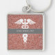 Get your day started off right with this Nurse Practitioner Rose Gold Glitter Personalized keychain. It is designed with a pink faux glitter background and grey horizontal stripe on the centre with your full name and occupation job title "FNP." A white caduceus symbol is on the centre.