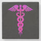 Bright pink caduceus design on black coaster