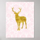 Nursery wall art in light pastel blush pink damask floral pattern, gold effect woodland deer with antlers illustration. Perfect to decorate a toddler or children's room.