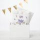 The invitation shows watercolor a baby cradle, a nursery mobile in the form of purple round clouds, children's toys: a rodent elephant, a duck on wheels, a teddy bear, a bunny, a bib, a pacifier, a pyramid.