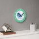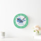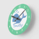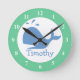 Nursery wall clock with numbers, whale print and baby name. Cute gift idea for little kids room. Blue and green nursery decoration with personalizable name. Sealife animal cartoon.