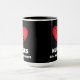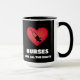 Here’s a mug that any nurse would love to have their coffee in. This design has a red heart with a shot and text that reads “NURSES CALL ALL THE SHOTS”. The handle and inside of the mug are black.