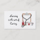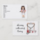 A nurse in her uniform with clipboard, stethoscope and BP cuff in hand ready for duty and all of your information while on the other side a clipboard, nursing cap and stethoscope with the caption Nursing is the art of Caring. Great for networking at conferences, to pass out with your resume, nurses week, graduation, or employee appreciation.