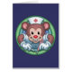 Happy retro-vintage cartoon nurse bear, with toony gloves, concentric frame, syringe in one hand and rectal thermometer in the other. Colourful design, on t-shirts, hoodies, cards, gifts.