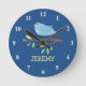 Nursey wall clock with cute bird on a branch illustration. Personalizable kids name. Cute gift idea for boy's baby room. Animal design.