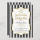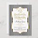 An elegant black and gold Nursing School graduation party invitation featuring faux gold glitter accent frame and black and white stripes with gold and black text and a stethoscope. A cute and elegant RN LPN APN Class Of Nurse School grad invite.