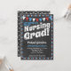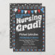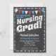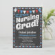 A fun and unique nursing graduation party invitation in chalkboard style with red, white and blue flags and a whimsical polka-dot border with dots on the back.