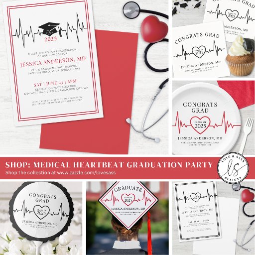 This heartbeat-themed graduation party sign features a bold black and white design, with a striking black double-line frame and a white background, adding a modern yet timeless touch. The classic serif fonts and clean, modern typography perfectly complement the EKG heart line, making it an ideal way to celebrate a medical or nursing school graduate. While the current design is in black and white, all colours—including the heartbeat line and background—can be customized to match school colours or the graduate’s favourite shades.