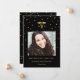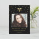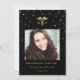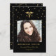 Black and gold nursing school graduation announcements with your own photo. A caduceus, 'RN', and confetti floats at the top of the announcement, with confetti overlaid on the photo. At the bottom you can personalize it with the new nurse's name, class year, and nursing school. On the back is a cute confetti, caduceus, and "congrats" pattern!