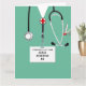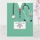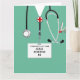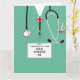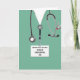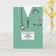Creative nursing school graduation card template featuring green hospital scrubs. To personalize edit text to add name of your favourite nurse, physician assistant or doctor.