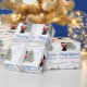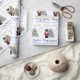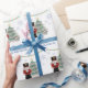 This colourful custom Christmas or holiday wrapping paper features a Nutcracker fairy tale theme. A large image of a nutcracker dressed in red and gold in placed on the left side of a beautifully decorated Christmas tree. A cute little mouse king is pictured to the right. Faux gold glitter accents the illustrated images and soft blue glitter snowflakes fall from the sky. A string of bright coloured lights accents the top. A sample Merry Christmas greeting is printed below the illustration in an elegant script font, followed by a sample family name. You can personalize the gift wrap to include your own custom name or other text.