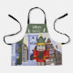 Kid's sized nutcracker Christmas apron is perfect for a German Bavarian theme. Cute Bavaria Christmas village with store fronts and snow is styled after Rothenburg, Germany. Nutcracker with bright red jacket and green hat is the finishing touch for a festive snow village scene. Easily your friend's or family member's name to the top of the kitchen apron. This is a perfect personalized gift for a child or grandkid who loves to cook and bake.