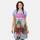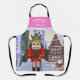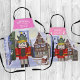 Light blue and red nutcracker Christmas apron is perfect for a German Bavarian theme. Cute Bavaria Christmas village with store fronts and snow is styled after Rothenburg, Germany. Nutcracker with bright red jacket and green hat is the finishing touch for a festive snow village scene. Easily your friend's or family member's name to the top of the kitchen apron. This is a perfect personalized gift for someone who loves to cook and bake.