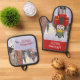 Light blue and red nutcracker Christmas oven mitt & pot holder set is perfect for a German Bavarian theme. Cute Bavaria Christmas village with store fronts and snow is styled after Rothenburg, Germany. Nutcracker with bright red jacket and green hat is vibrantly displayed on the oven mitt. A friendly snowman is displayed on the pot holder. Easily your friend's or family member's name to both the mitt and pot holder.