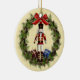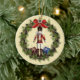 Beautiful red nutcracker doll in wreath round Joyeux Noël, French Christmas ornament. This lovely double sided holiday art ceramic ornament features a red nutcracker in the centre of a holiday wreath with pine cones and berries! The back also has a lovely wreath and bow with the words "Joyeux Noël" - Merry Christmas in French language, and the year! A wonderful addition to your ornament collection, holiday decor and a great gift for family, friends and someone who loves the nutcracker!