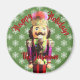 A realistic image of a traditional Nutcracker is printed on a green background with a festive snowflake pattern on a cute Christmas magnet. There is a template for your custom name in red letters and you can personalize the greeting. An excellent gift for any ballet lover or dancer.