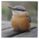 A close-up photograph of a slate blue and pale orange Eurasian Nuthatch, Sitta europaea, sitting on a garden table.