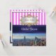 Customizable Invitations and accessories with an iconic view of the New York City skyline from the top of 30 Rockefeller Centre, featuring a photo of the Empire State Building, into lower Manhattan including the World Trade Centre. They also feature a pink and white pattern, a navy blue ribbon and a white gradient label in a gold look frame. (Note: Some coordinating accessories don't have the photo noted above.)