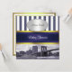 Customizable Invitations and accessories with an East River view of New York City's iconic Brooklyn Bridge and Municipal Building with a boat passing by. tint. It also features a navy blue and white stripe pattern, a navy and gold ribbon and a white gradient label with your choice of a silver or gold colour pearl frame. Image is in a blue & white tint. The reverse is framed in gold.