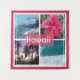 Stunning photo collage taken in Oahu, Hawaii featuring a sandy beach, palm trees, a lavender sunset over the horizon, and an aqua blue ocean.