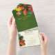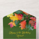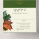 Autumn oak leaves, birthday party all-in-one invitation with attached RSVP card. This all-in-one invitation can be used for a large celebration that requires reply cards for guests. This design works for men or women. A big cluster of dark green and orange-red oak and maple leaves decorate under the flap, at top of invitation. The leaves image also carry onto the reply card where a menu list can be included, or change the wording to a simple “will attend” and “will not attend". Mailing addresses (and return address) can be printed on the front. Also get the detachable reply card ready to mail by adding your address to the front of the card. They can drop the reply card, which is postcard size, in the mail without an envelope. The inside background colour is a forest green with golden yellow text, except for the RSVP card which is ecru with green text. The outside of the card has a graphic fall tree image. If an outer envelope will be used, remove the addresses accordingly.