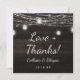 Oak Ridge Rustic Dark Brown Barn Wood, Sparkling Mason Jars, and Glowing String Lights Design with Twinkling strands of dangling lights and jars on a deep rich wood texture with white accents. With Modern Typography Script Fonts. A rustic elegant country farmhouse style design - Personalized Wedding Love and Thanks Square Thank You Card!