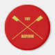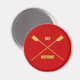 Fun magnet for a keen rower or sculler. "Oar inspiring", awe inspiring, crossed oars and a pun in a golden colour on a deep red background.