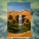 A captivating artwork depicting a cascading waterfall emerging between golden sand dunes, surrounded by lush palm trees and a vibrant green oasis. The painting reflects the contrast of nature between arid desert and flourishing greenery, creating a serene scene that transports the viewer to a world of tranquillity and calm, where sand and water meet in stunning visual harmony.