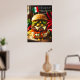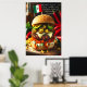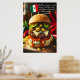 Experience a heatwave of flavour with this sizzling Oaxaca Chipotle Burger. A spiced beef patty, grilled to juicy perfection, is topped with melted Oaxaca cheese, roasted jalapeños, a generous drizzle of chipotle mayo, and fresh avocado slices. All stacked high on a corn-dusted bun. A small Mexican flag adds a festive touch, while a blurred backdrop of chili peppers and fresh cilantro completes this Mexican culinary creation.