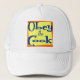 A hat reading Obey the Cook, a snappy kitchen slogan. You must obey the cook if you want to eat! For chefs with an attitude! A funky 50's font in blue on a yellow and orange background.