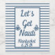 Parfaitement preppy seersucker rayé personnalisable "Let's Get Nauti" étiquette de vin en rayures bleu marine et blanc avec lettrage marine pour votre soirée de bachelorette nautique!