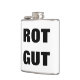 Obvious label flask says ROT GUT in big, plain, simple, easy to read letters so that you never mistake your fruit flavoued soft drink flask for your booze. (Those sugary soft drinks will kill you!) Great way to carry your high octane hooch around with you.