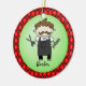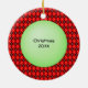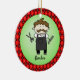 Funny cartoon drawing of a male hair stylist with moustache, holding a comb and scissors, wearing an apron. Background is a green "bubble" on red and black argyle pattern. Reverse side is ready for your custom date - you can even add a name or other text to create your own unique one=of-a-kind professional ornament. From Ornament Central. Drawing courtesy of Lettering Delights, com.